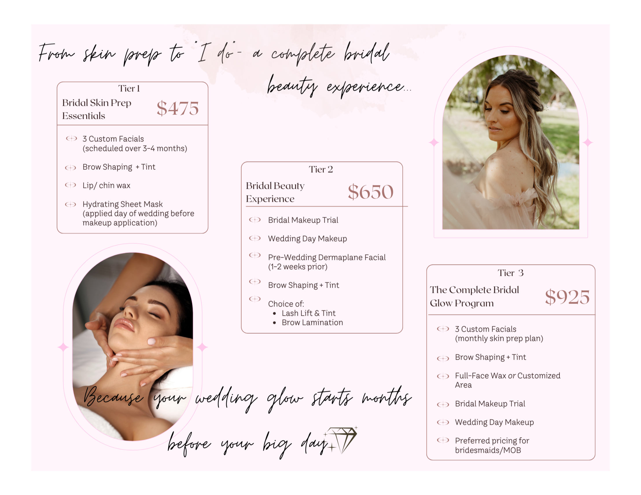 Bundled skincare and bridal makeup services designed to prepare your skin for your wedding day.